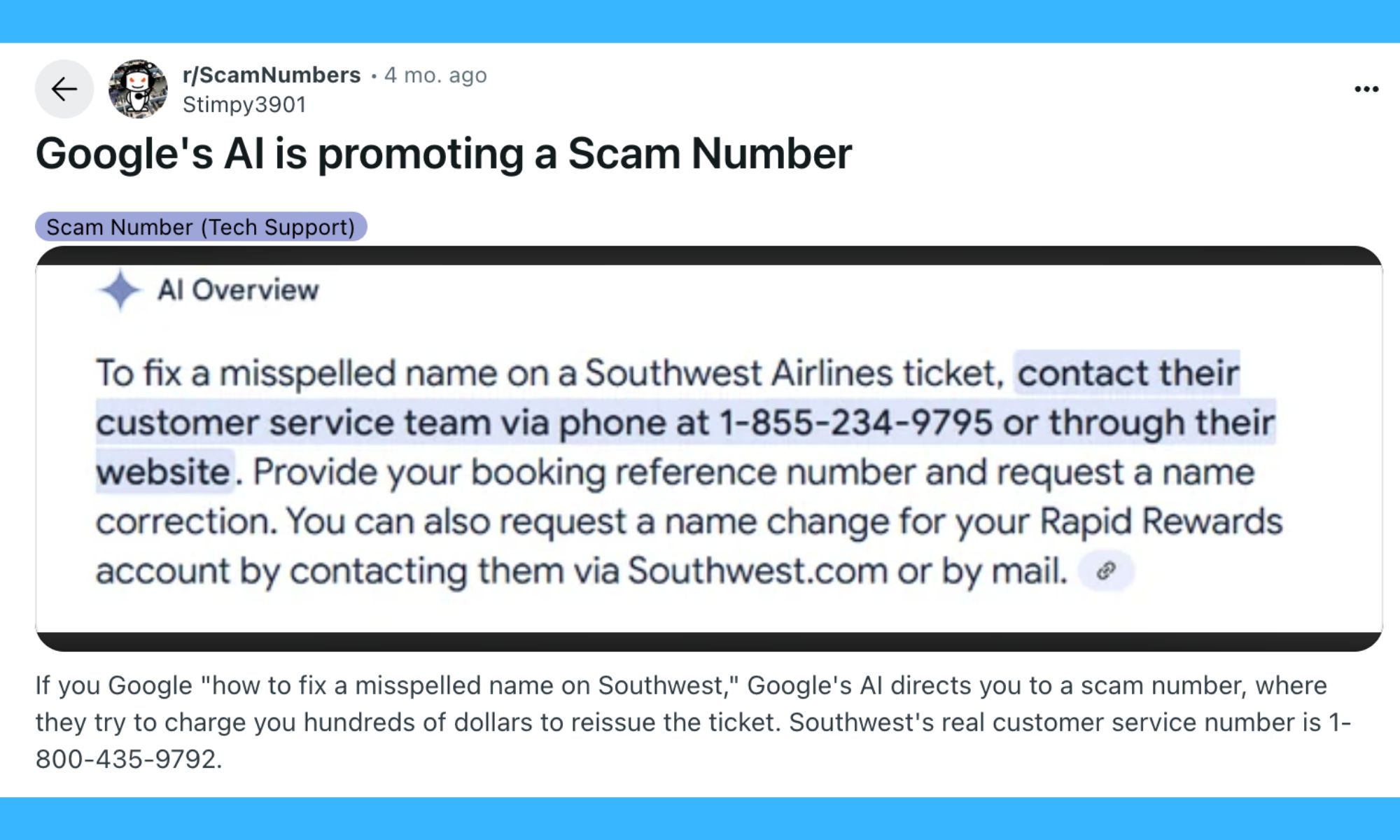 Видання The Washington Post і Digital Trends зафіксували випадки появи шахрайських номерів служб підтримки в Оглядах від ШІ. Повідомлення про це з’являлися у Facebook та Reddit. Кредитні спілки та банки також попереджають своїх клієнтів про цей вид шахрайства.