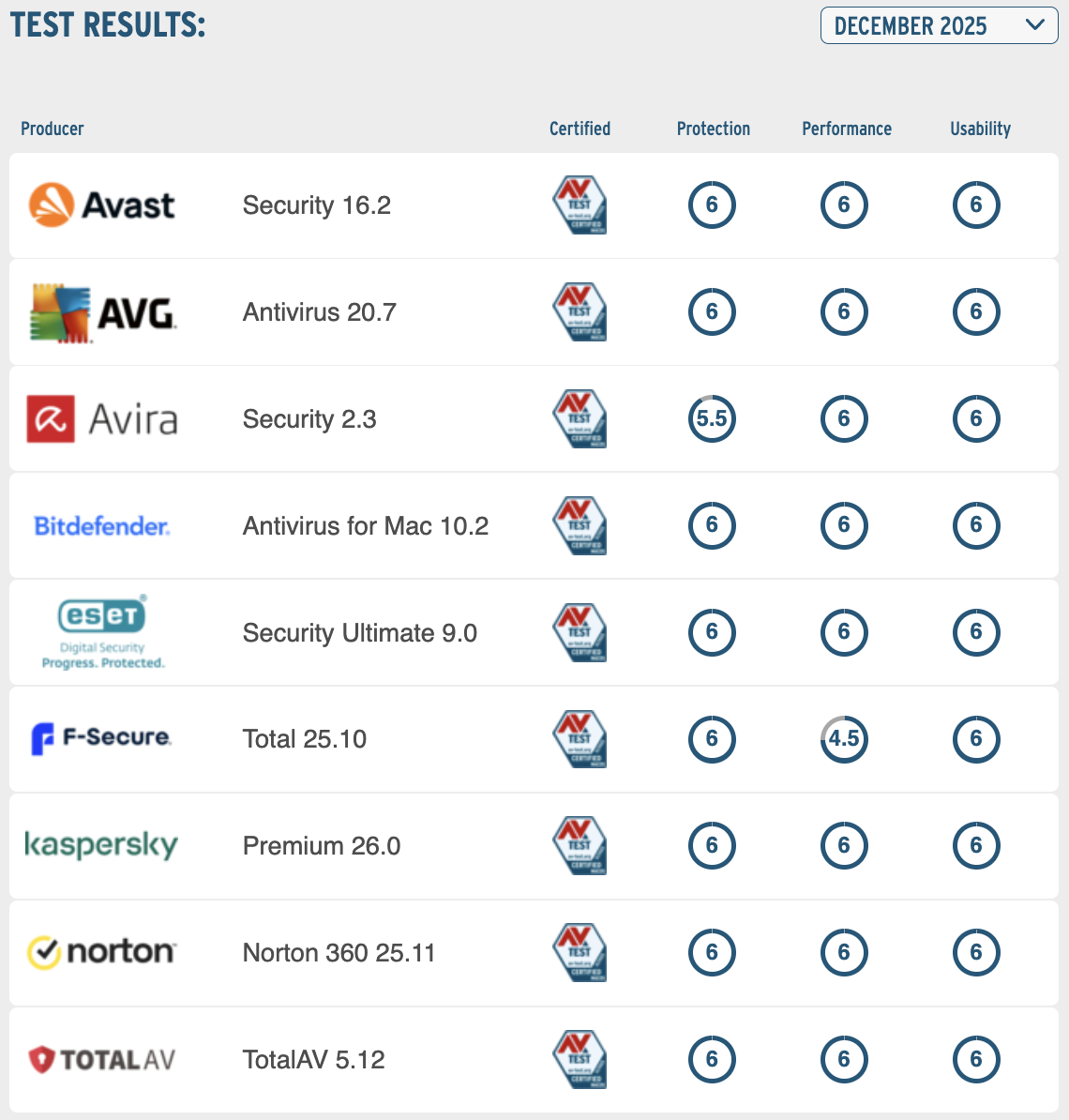 Лабораторія AV-Test провела всебічне тестування антивірусних рішень для macOS у грудні 2025 року — це найактуальніші дані станом на сьогодні. Експерти перевірили популярні антивірусні продукти, використовуючи понад 1000 зразків шкідливого ПЗ, спеціально розробленого для macOS, а також понад 80,000 легітимних додатків для виявлення помилкових спрацювань.