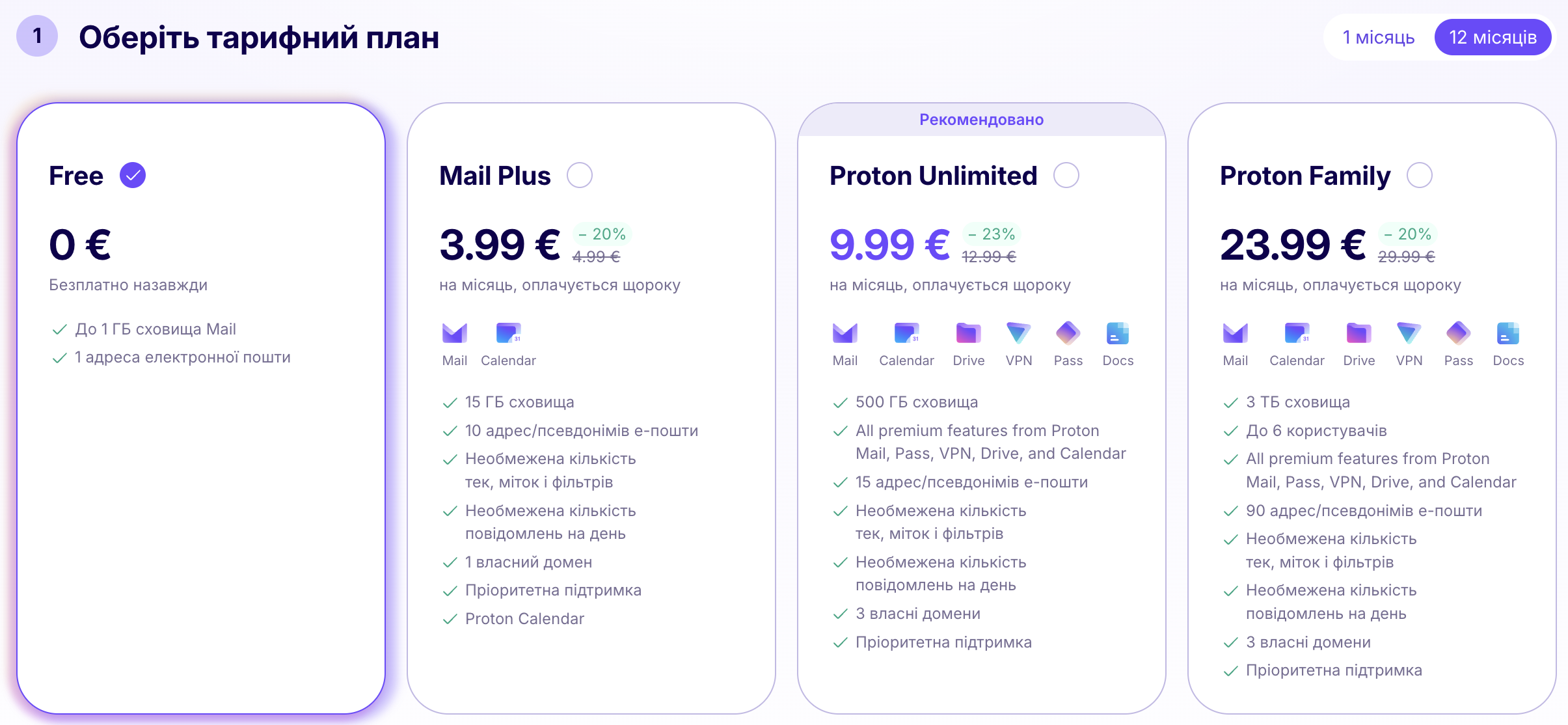 Обмеження безкоштовного тарифу: Безкоштовний Proton Mail обмежений 1 ГБ сховища та 150 повідомленнями на день. Для активних користувачів може знадобитися платний план.