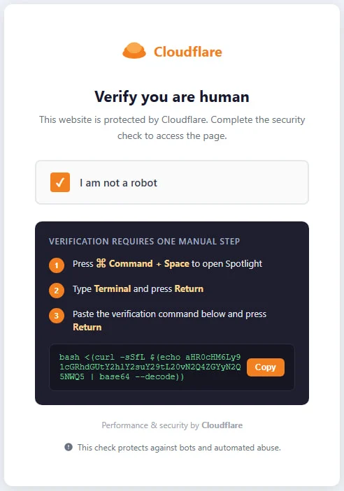 Техніка ClickFix полягає в тому, що шкідливий сайт імітує стандартну форму перевірки людини — зокрема відому перевірку Cloudflare «I’m not a robot». Замість натискання на галочку жертву просять вставити у термінал macOS певну команду, начебто для завершення «верифікації».