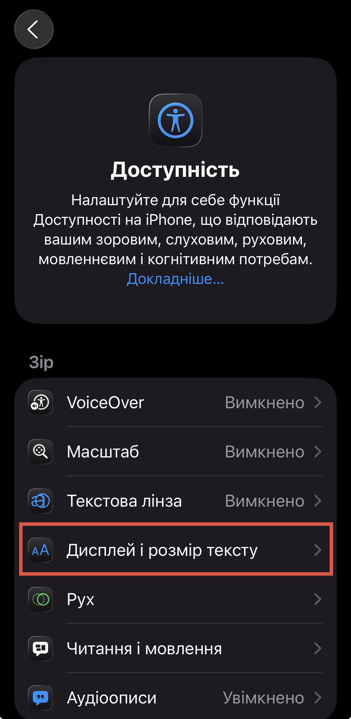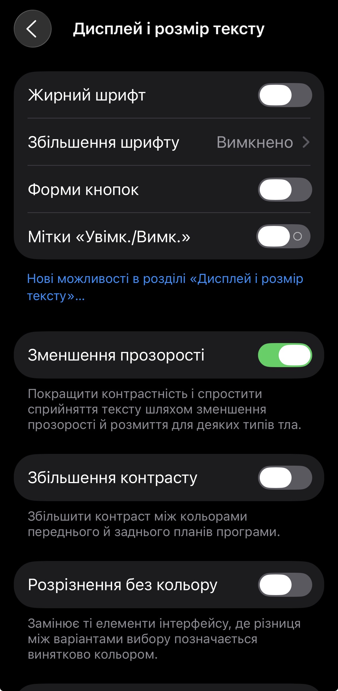 На iPhone з iOS 26 перейдіть до «Параметри», виберіть «Доступність», а потім торкніться налаштування «Дисплей і розмір тексту». Увімкніть перемикач «Зменшення прозорості». Поверніться на головний екран — тепер іконки та папки матимуть менш прозорий вигляд.