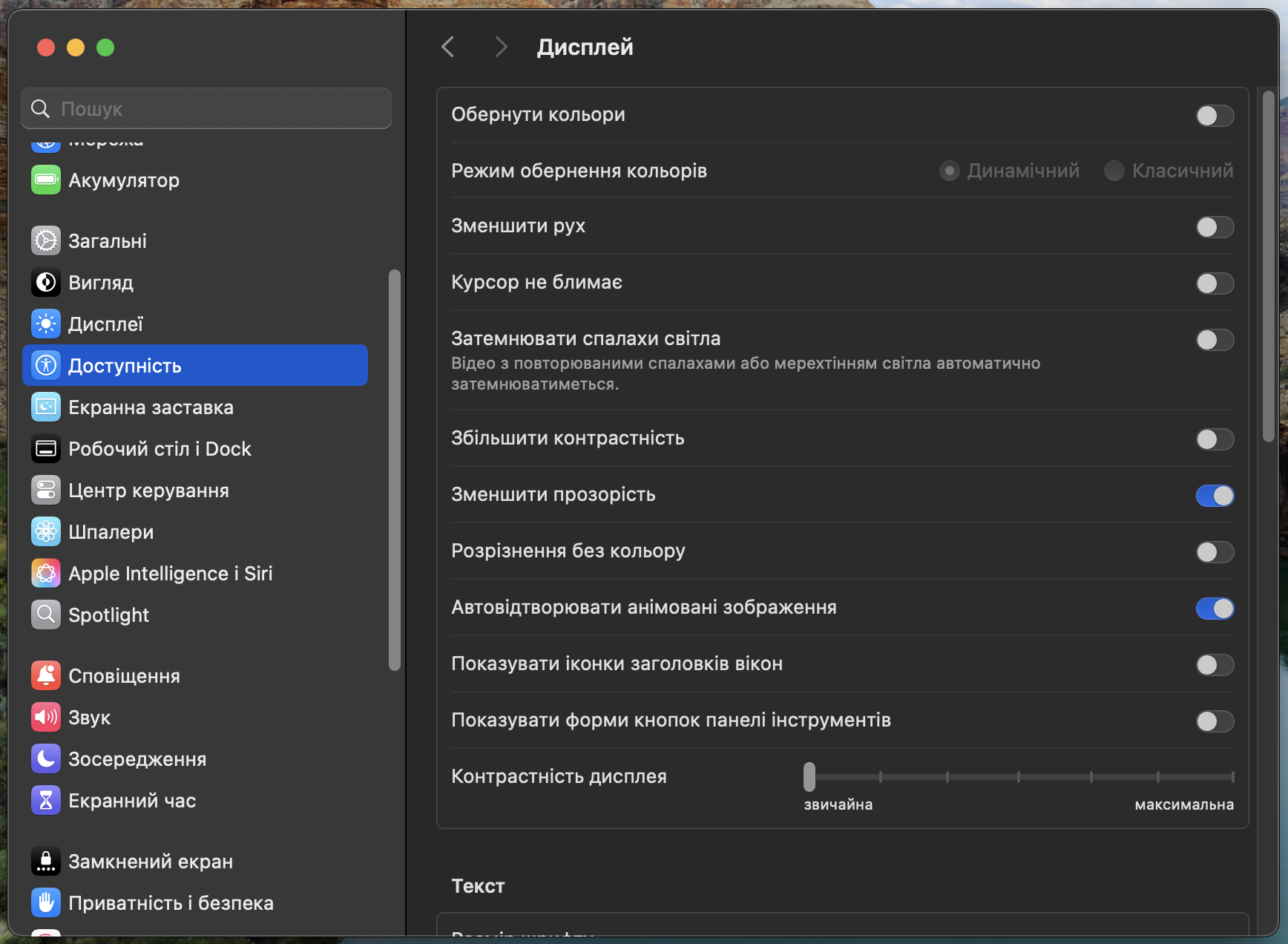 На Mac з MacOS 26 Tahoe перейдіть до «Системних параметрів» та виберіть «Доступність». У розділі «Зір» торкніться налаштування «Дисплей», а потім увімкніть перемикач «Зменшити прозорість». Відкрийте вікно, щоб побачити, як тепер виглядають папки та іконки.