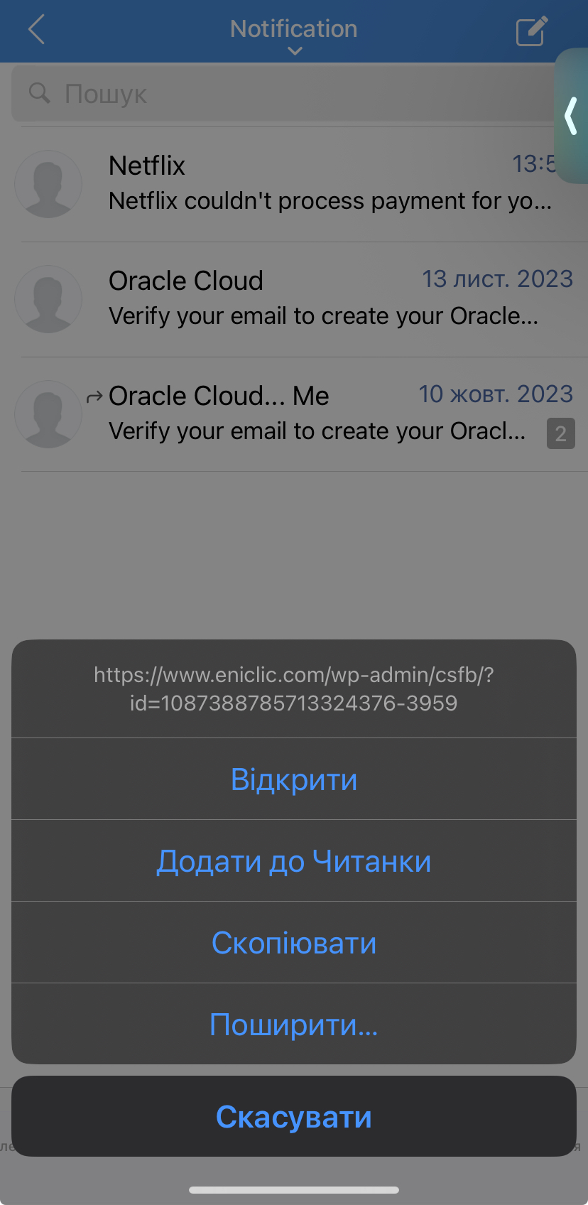 У нашому прикладі зображено посилання https://netflix.com/billing-update, яке на перший погляд виглядає як офіційна адреса Netflix, однак насправді веде на шахрайський сайт, призначений для крадіжки ваших даних.