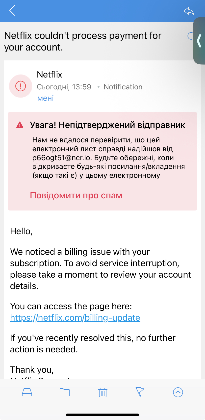 Нещодавно користувачі почали масово отримувати підозрілі повідомлення, що нібито надходять від Netflix. Ось типовий приклад такого шахрайського листа:
