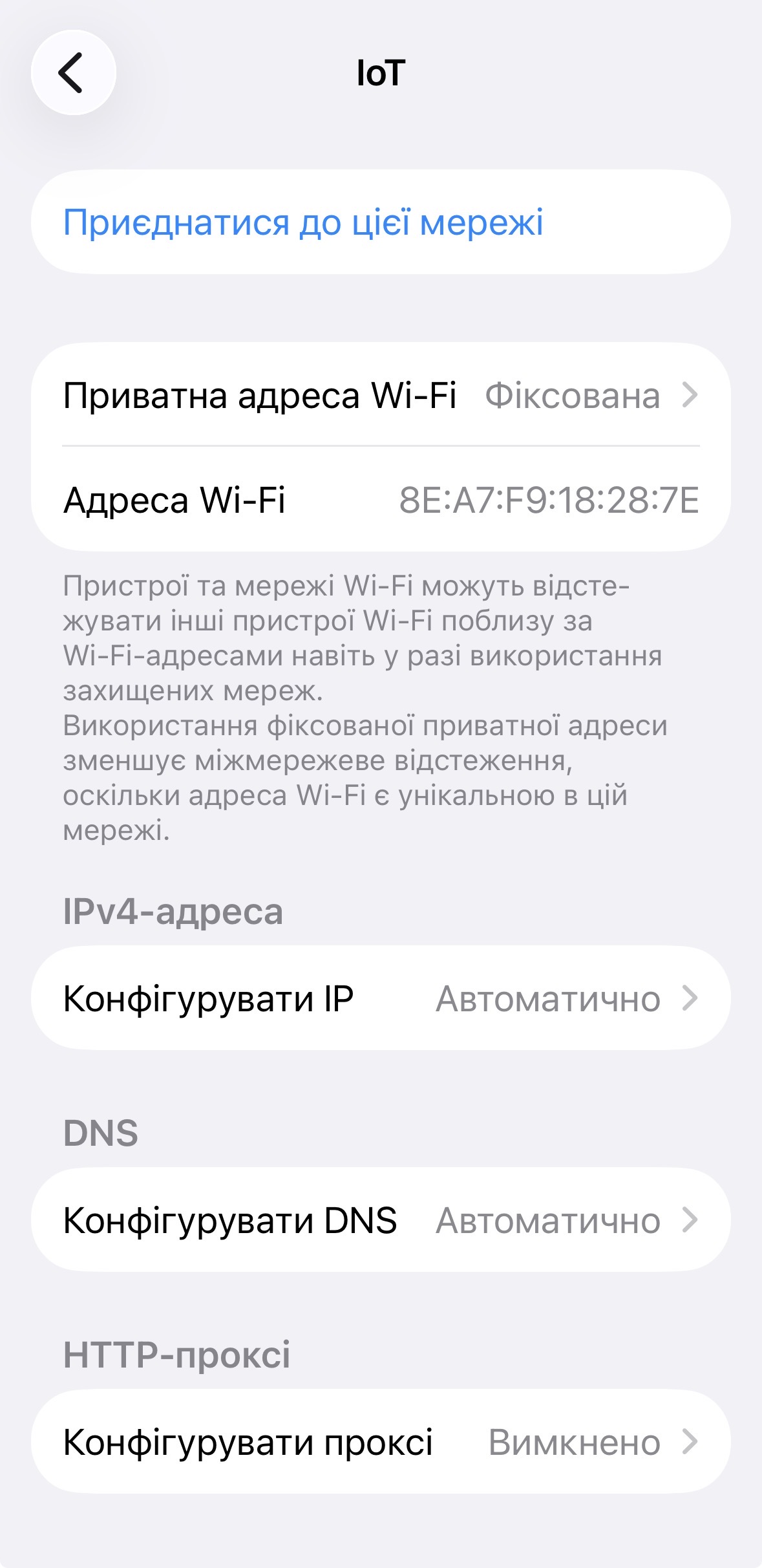 Вимкнено — пристрій використовує реальну MAC-адресу. Мережі можуть ідентифікувати та відстежувати його необмежено. Цей варіант не рекомендується для публічних мереж.