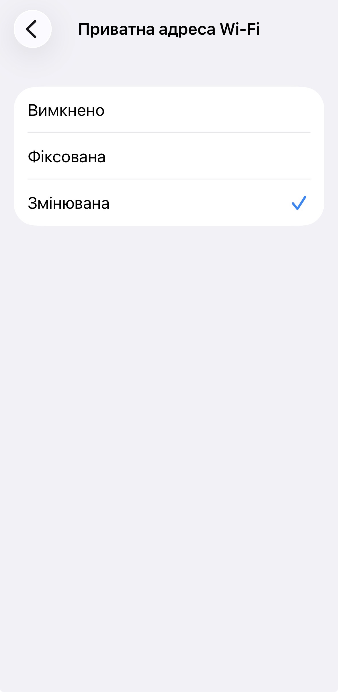 Фіксована — пристрій використовує рандомізовану адресу, яка залишається незмінною для цієї мережі. Захищає від міжмережевого відстеження, але один оператор мережі може впізнати пристрій з часом. Підходить для домашнього або офісного Wi-Fi.