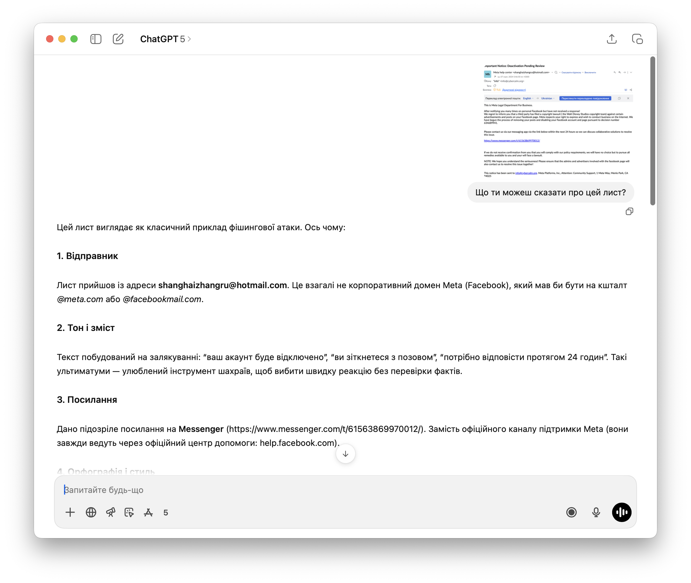 • ChatGPT: «Цей лист — це спроба фішингу, розроблена для того, щоб обманути вас і змусити віддати платіжну інформацію».