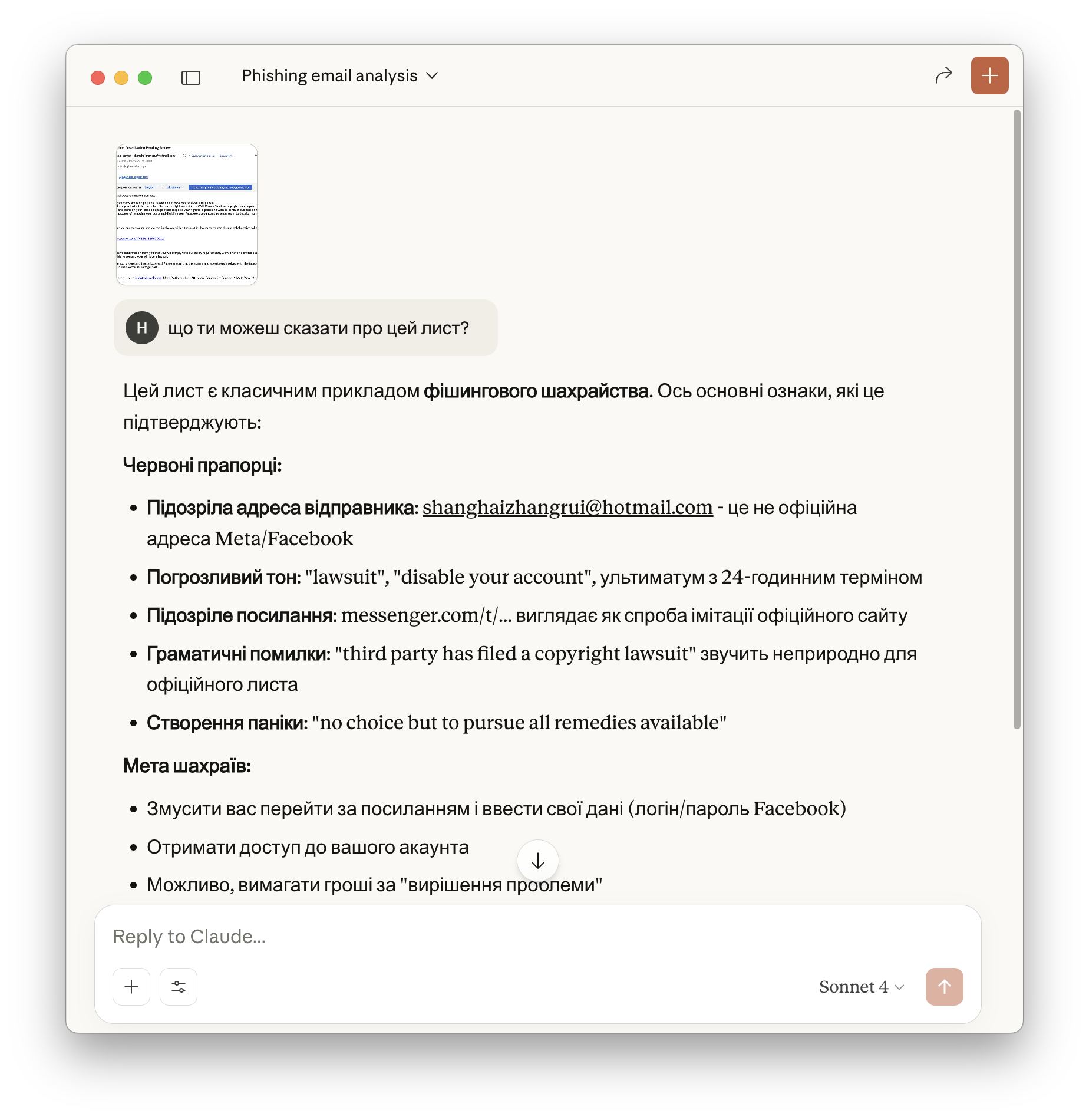 Використовуючи той самий запит «що ти можеш сказати про цей лист», Claude Sonnet 4 також швидко взявся пояснювати, чому те, на що я дивлюся, є явним шахрайством. Подібно до ChatGPT, він виокремив кілька специфічних характеристик, які чітко показують фішинговий лист: погрозливий тон, терміновість, підозрілі посилання тощо.