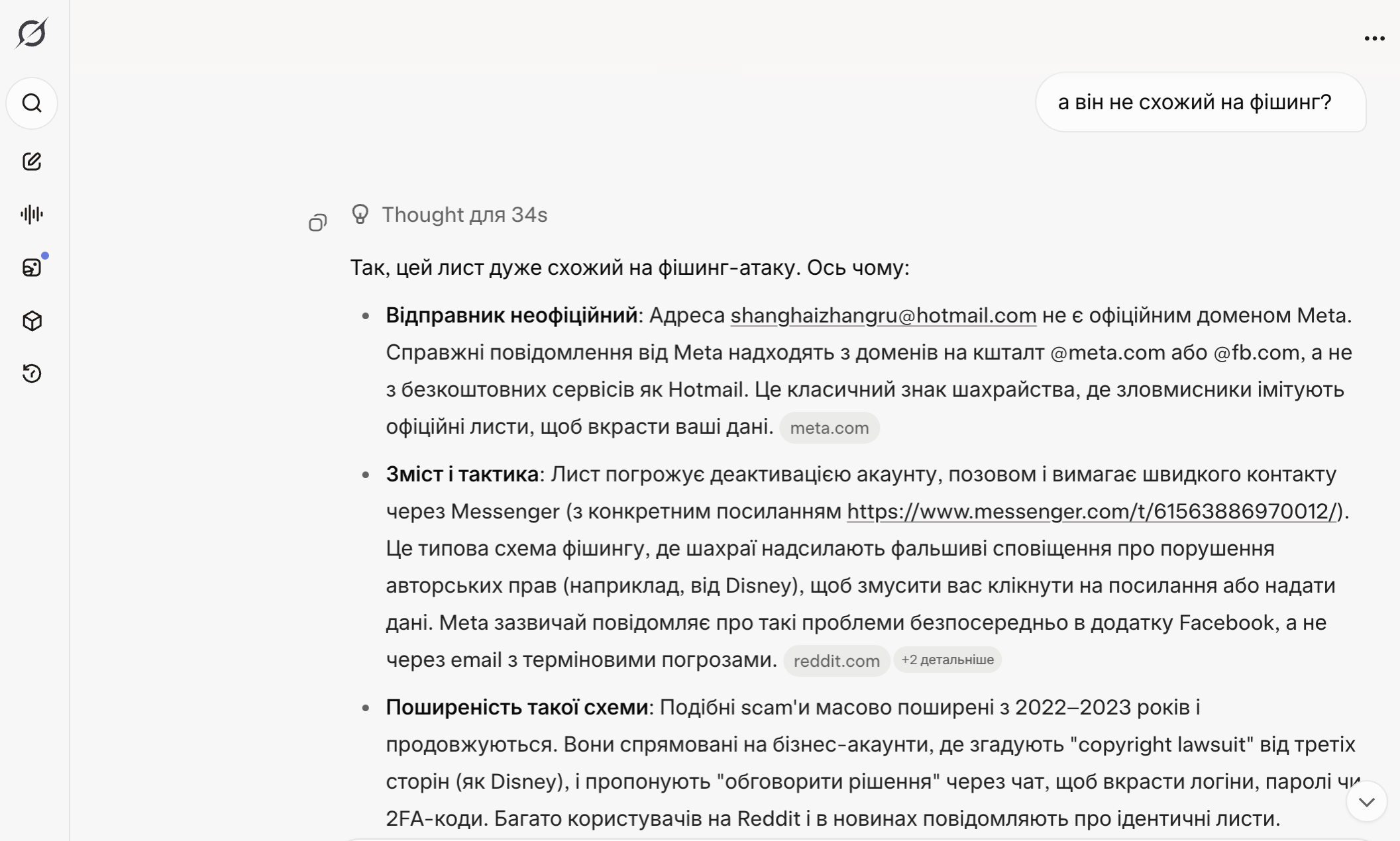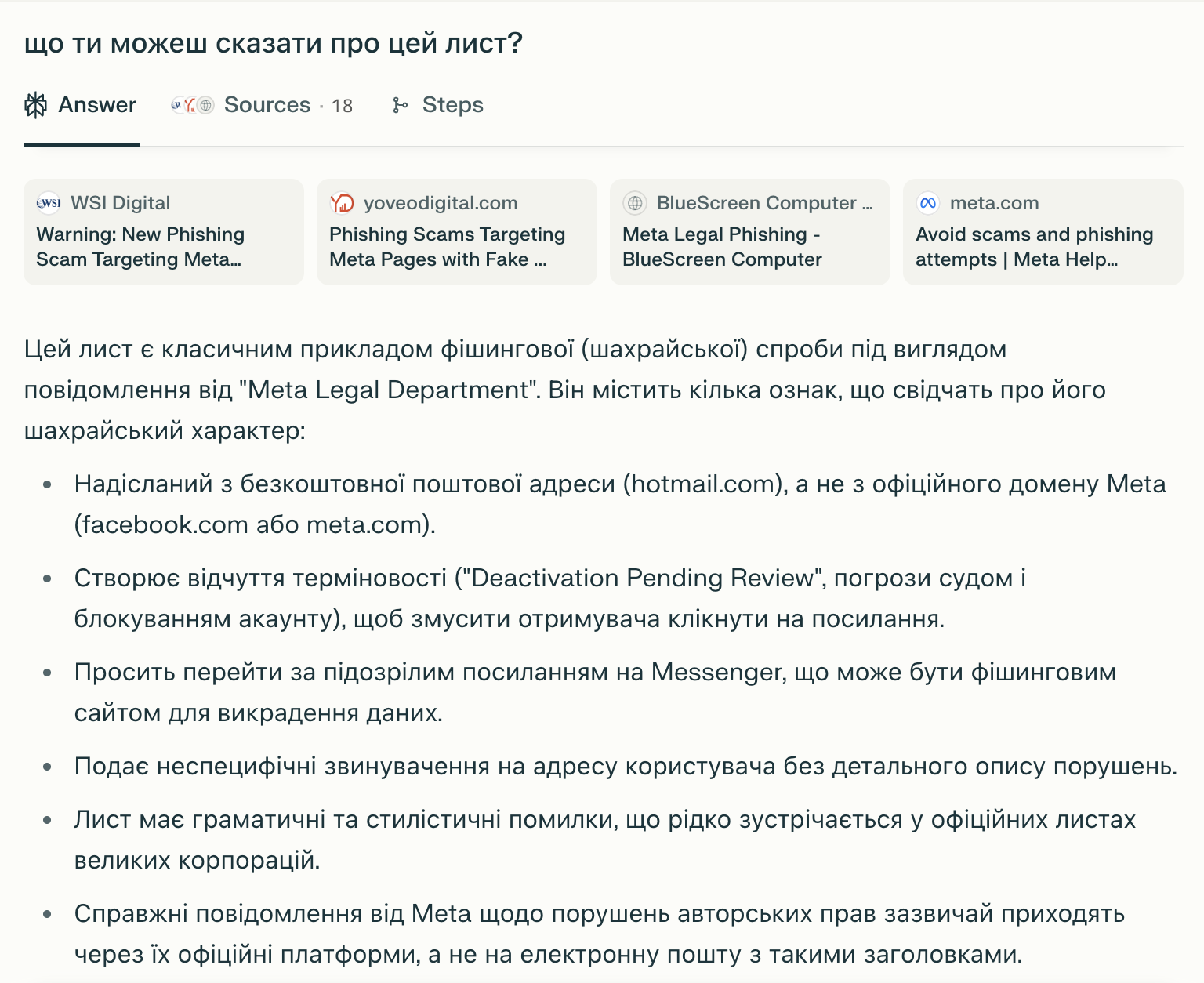 • Perplexity: «Цей лист явно схожий на спробу фішингу».