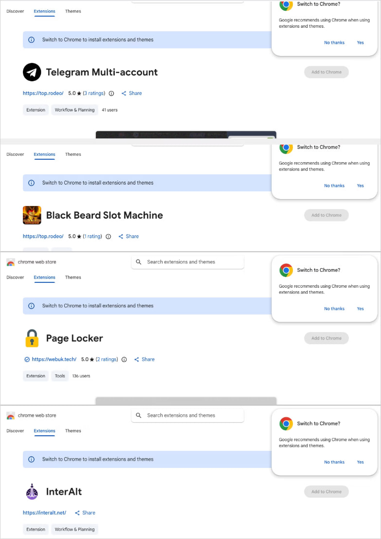 Крім того, виявлено три розширення, які вимикають заголовки безпеки та впроваджують рекламу на YouTube і TikTok, одне, що перенаправляє запити перекладу через шкідливий сервер, а також неактивне розширення для крадіжки сесій Telegram із поетапною інфраструктурою.