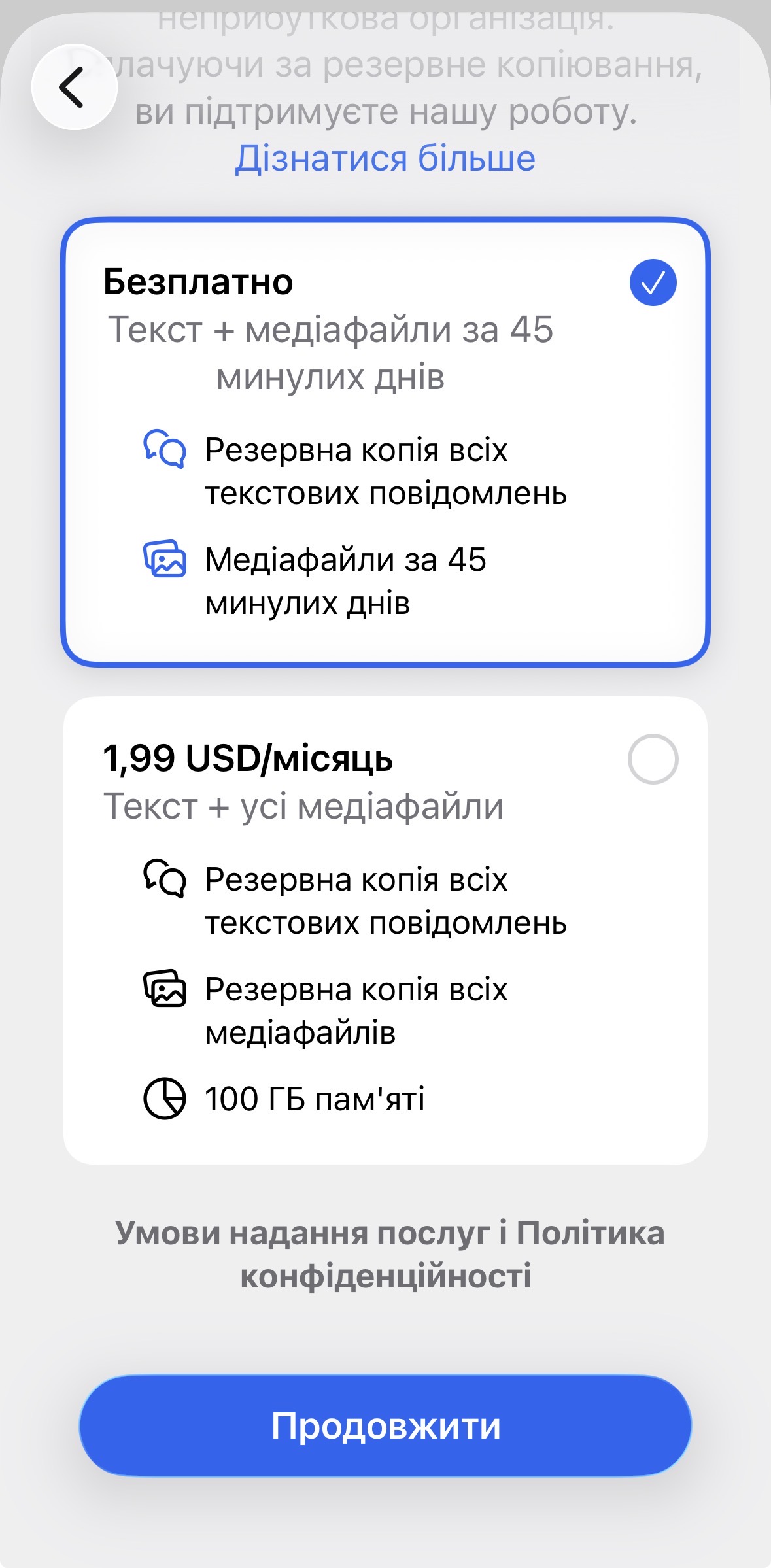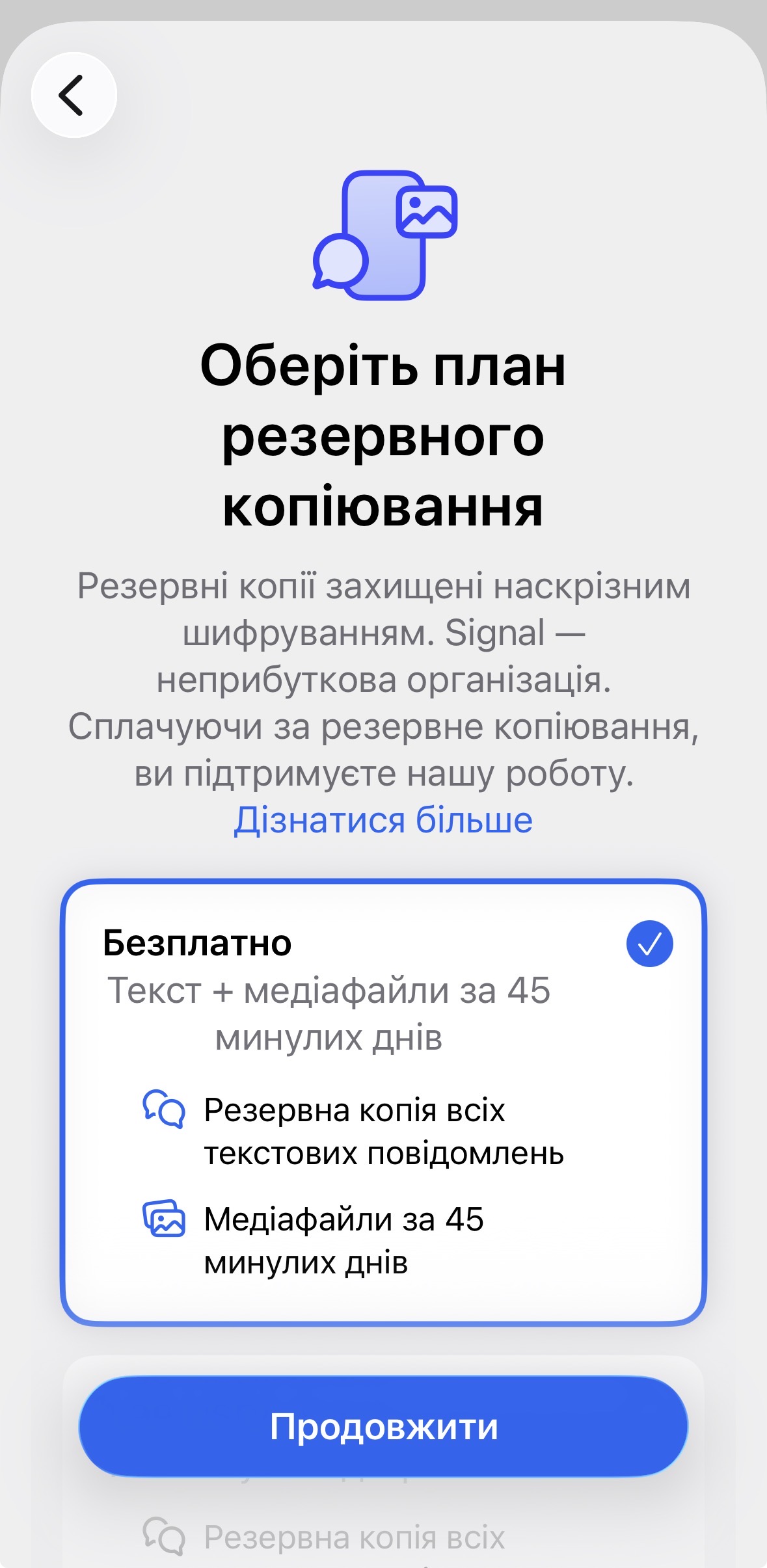 Резервне копіювання з наскрізним шифруванням включає безкоштовне зберігання текстових повідомлень та медіафайлів за останні 45 днів. Для зберігання старіших медіафайлів Signal пропонує платну підписку за $2 на місяць — це перша платна послуга компанії.
