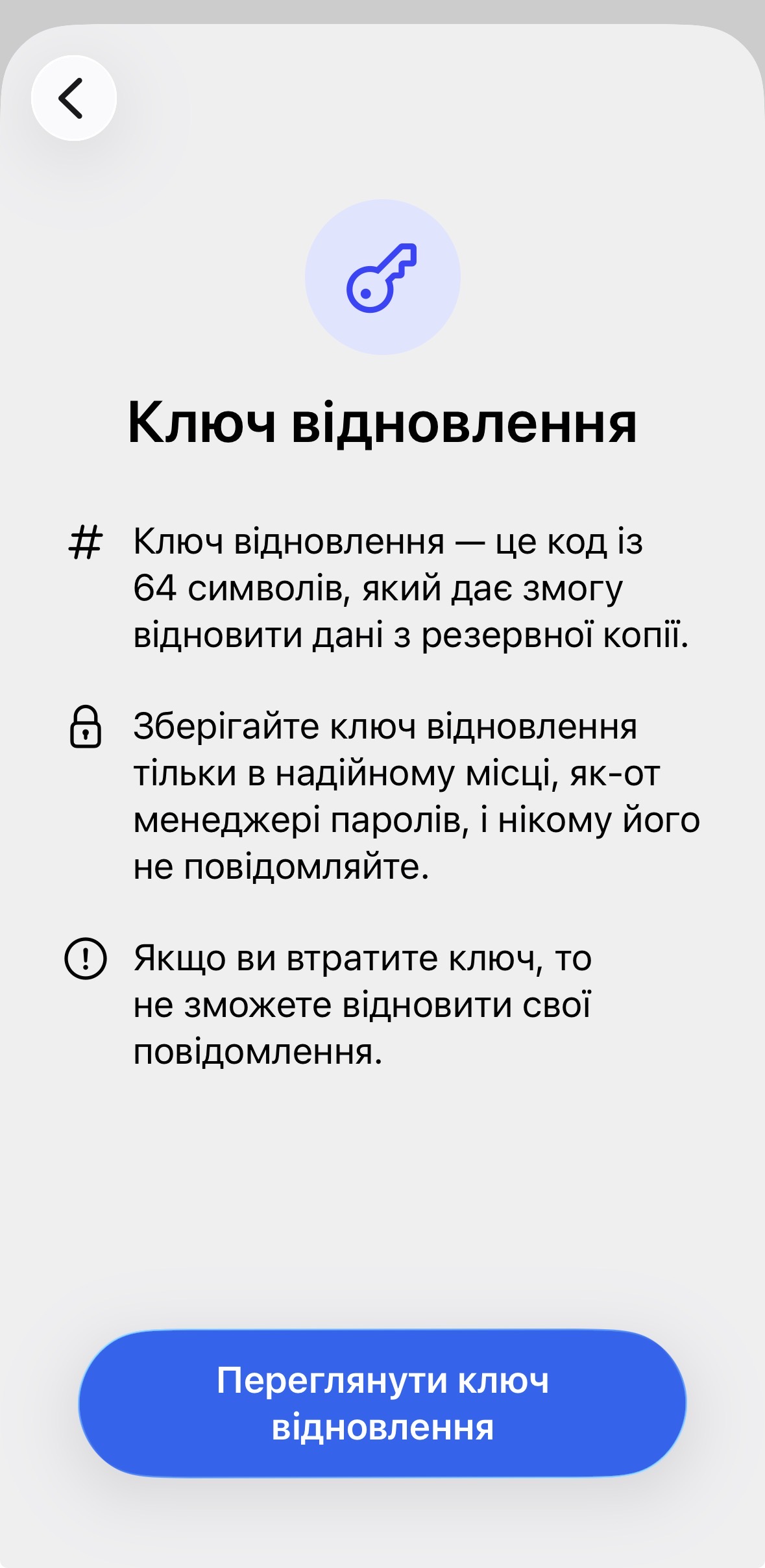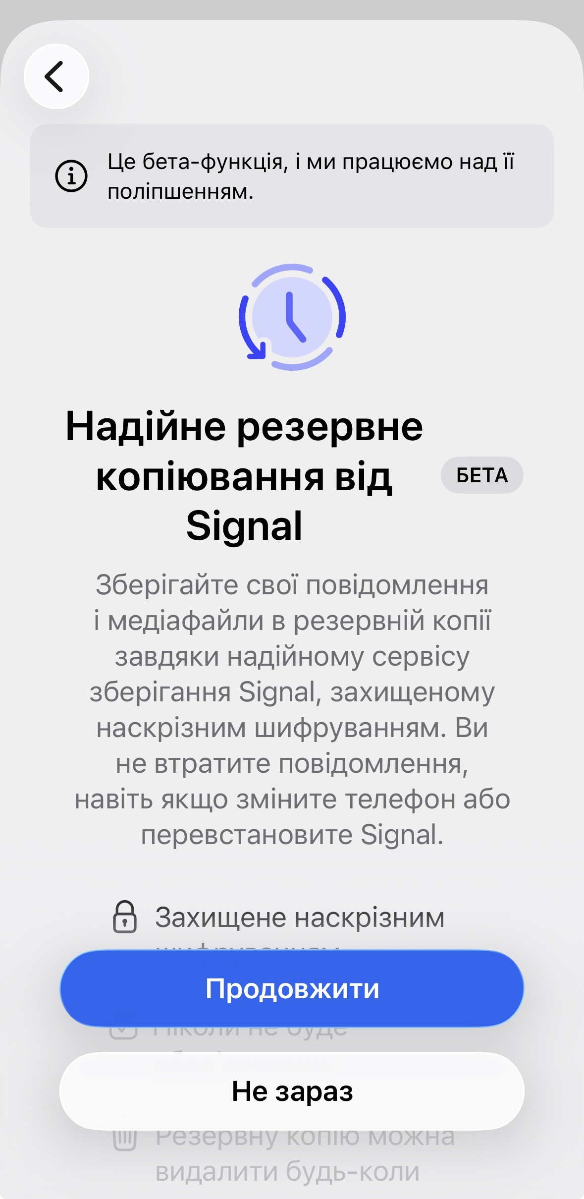 Система автоматично створює резервні копії щодня після активації функції. Для доступу до резервної копії використовується 64-символьний ключ відновлення, який зберігається виключно на пристрої користувача. Signal не має можливості відновити цей ключ, що гарантує повний контроль користувача над власними даними.