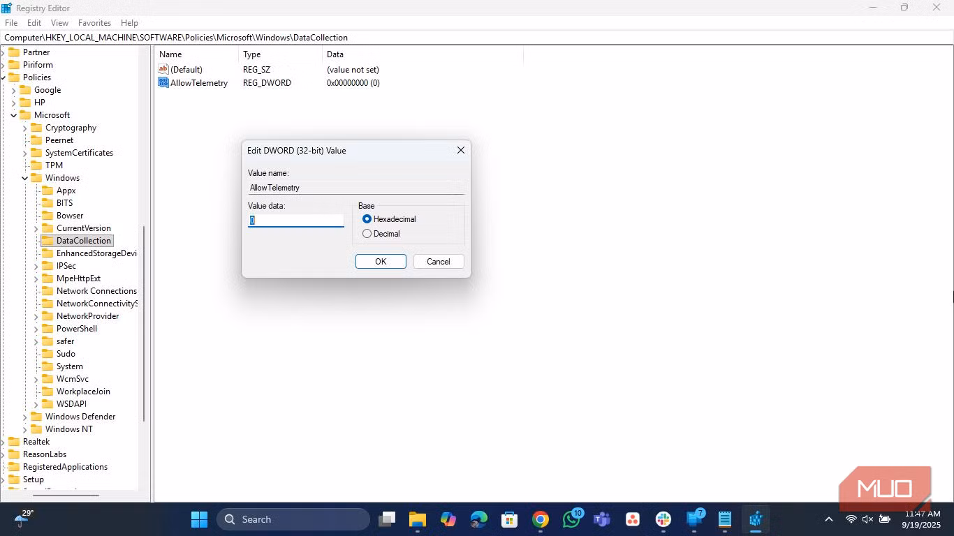 Якщо вам комфортно працювати з редактором реєстру, ви можете досягти того ж результату, відкривши редактор реєстру та додавши ключ DWORD під назвою AllowTelemetry за адресою HKEY_LOCAL_MACHINE\SOFTWARE\Policies\Microsoft\Windows\DataCollection зі значенням 0.