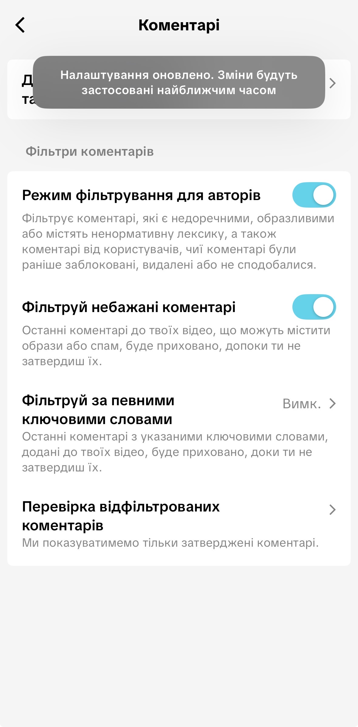 TikTok також запускає Режим фільтрування для авторів (Creator Care Mode), який автоматично фільтрує всі коментарі, що ідентифікуються як образливі, неприйнятні або нецензурні. Він також фільтрує коментарі від користувачів, чиї коментарі скаржаться, отримують дизлайки або видаляються.