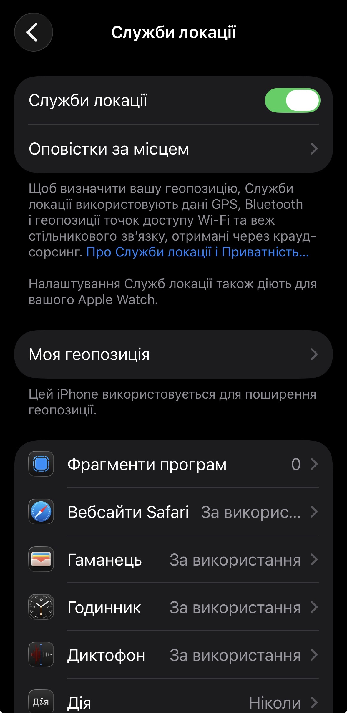- Відкрийте «Параметри» → «Приватність і безпека» → «Служби геолокації».