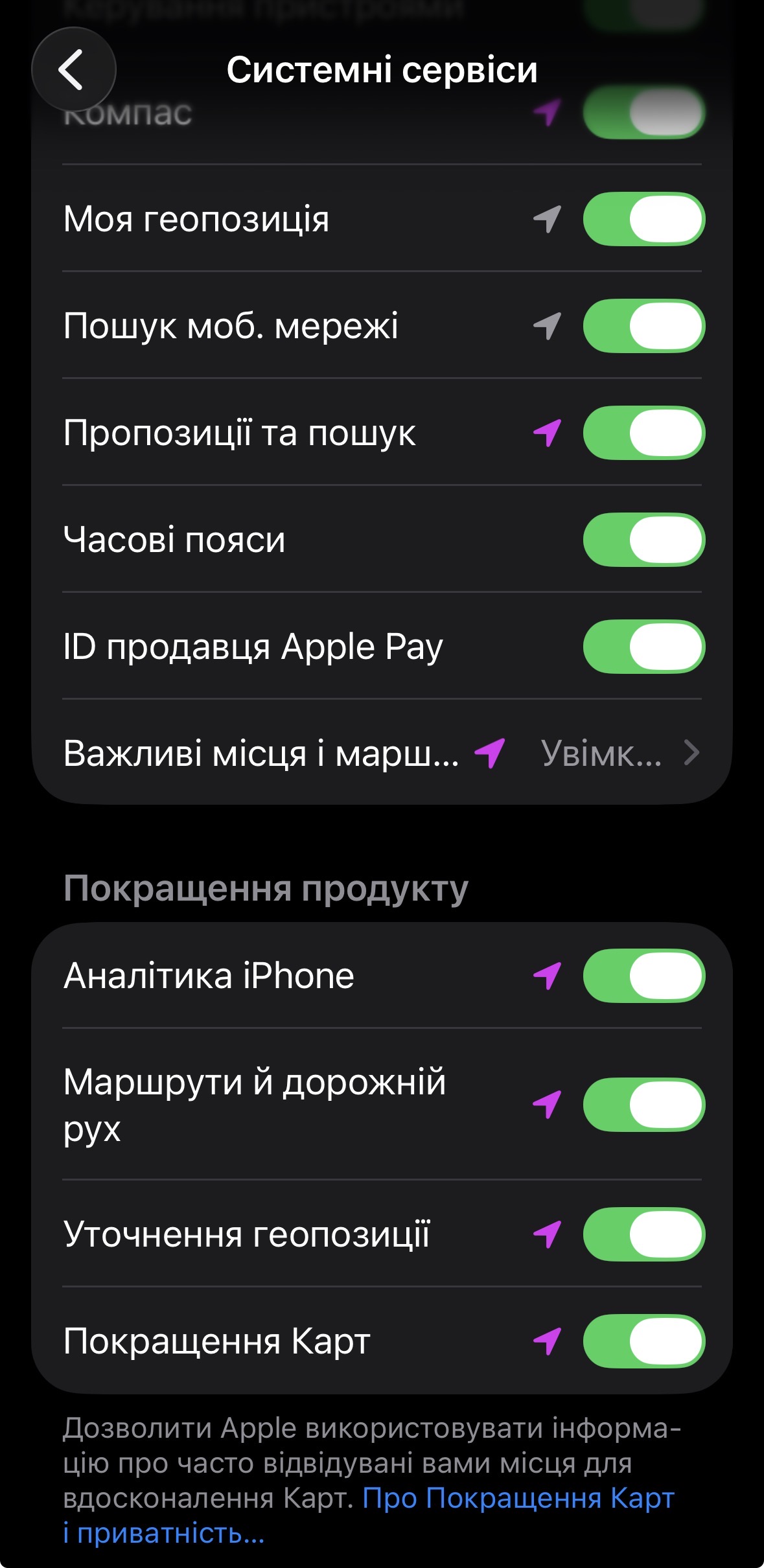 - Перейдіть у Параметри → Приватність і безпека → Служби локації → Системні сервіси та увімкніть «Де iPhone» — це допомагає пристрою визначити, чи переміщується невідомий трекер разом з вами до постійних локацій.