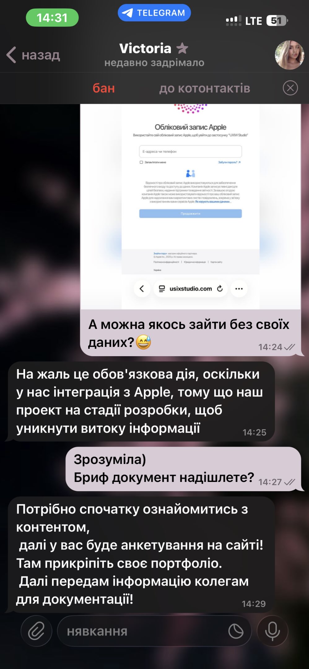Комунікація побудована з метою знизити пильність потенційної жертви: швидкі відповіді, надмірне використання емотиконів, акцентування на простоті завдання (“нічого складного, всього кілька хвилин”), заклики заповнити анкету негайно. Пояснення про “захист інформації” використовуються як псевдотехнічне обґрунтування вимоги ввести облікові дані Apple ID.
