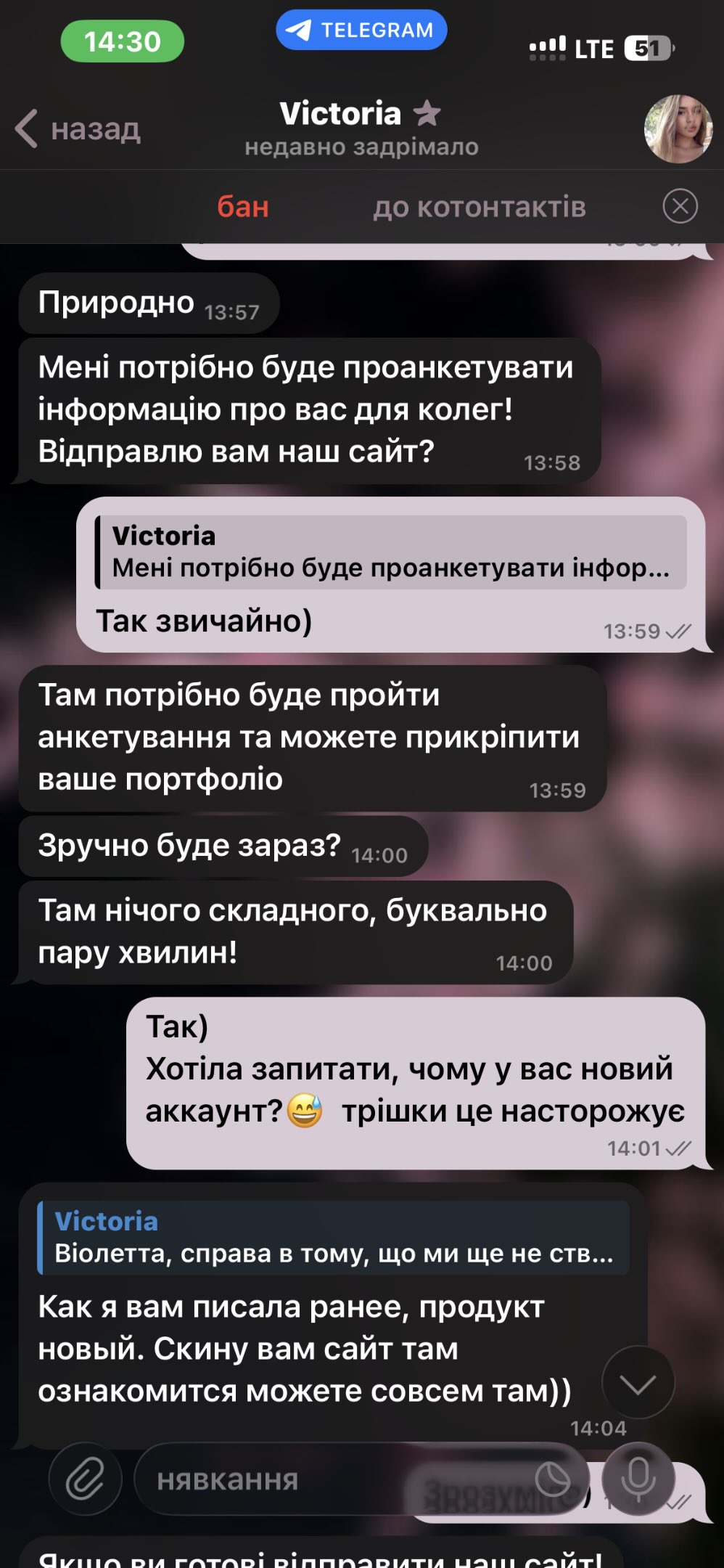 Запропонована оплата значно перевищує середньоринкові ставки за аналогічну роботу, при цьому роботодавець не висуває чітких KPI (ключових показників ефективності) та не пропонує укласти формальний трудовий договір. Такий підхід типовий для масових job-scam кампаній у месенджерах.