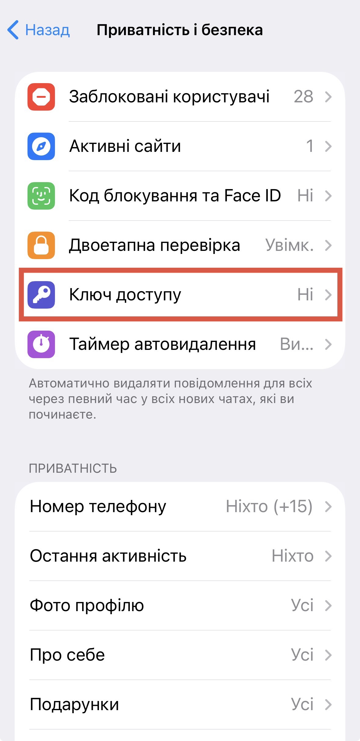 Telegram не пропонує опцію ключів доступу: переконайтеся, що встановлена остання версія додатка. Деякі регіони можуть отримати доступ до функції пізніше через поетапне розгортання.