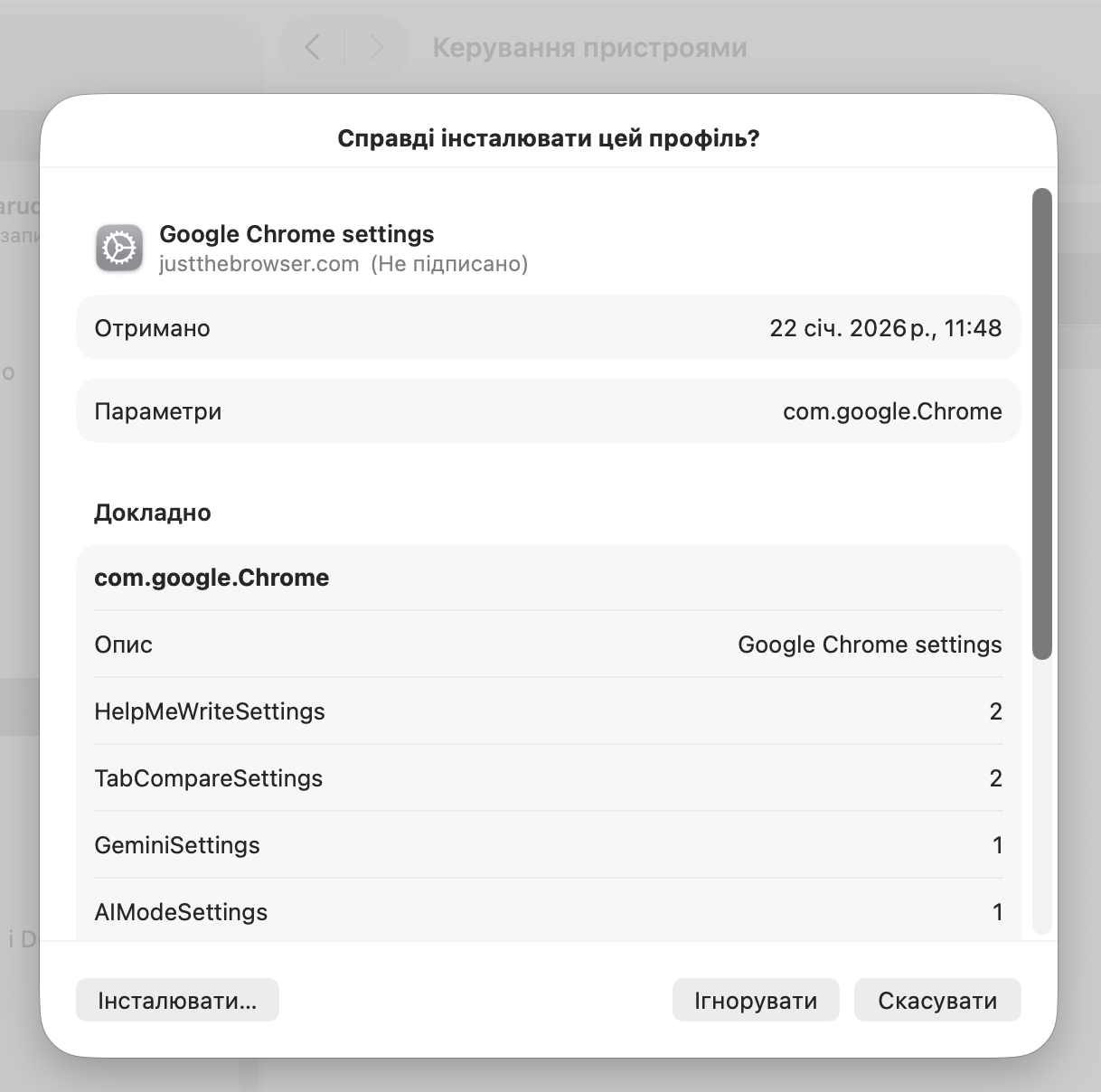 На macOS після запуску скрипту потрібно відкрити Системні параметри → Загальні → Керування пристроями, де з’явиться запис для відповідного браузера. Подвійне клацання на цьому записі покаже всі функції, які Just The Browser вимикає — їх більше, ніж можна очікувати.